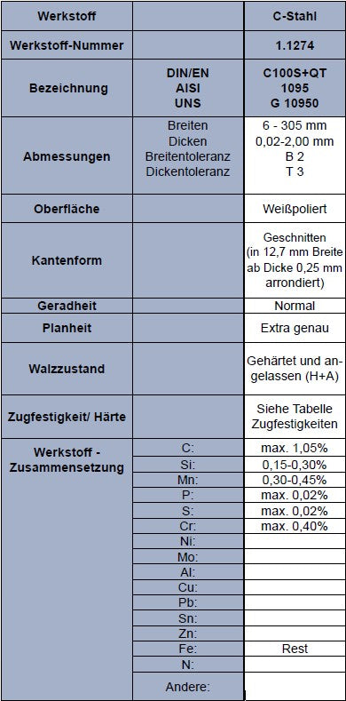 Angaben zum Material: Mit einem Kohlenstoffgehalt von über 1% ist dieser Werkstoff sehr gut geeignet für Fühlerlehrenbänder und Unterlegfolien sowie für hochbeanspruchte Federn, an die keine Ansprüche hinsichtlich Korrosion gestellt werden.